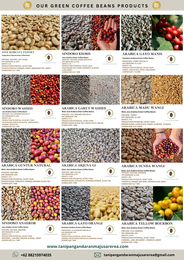 Here are the finest Arabica and Robusta green coffee beans we have to offer. These coffee beans come from some of the best coffee-producing regions in Indonesia. Thanks to high processing standards and strict quality control, we can guarantee that our coffee beans meet the requirements of both local and international markets.